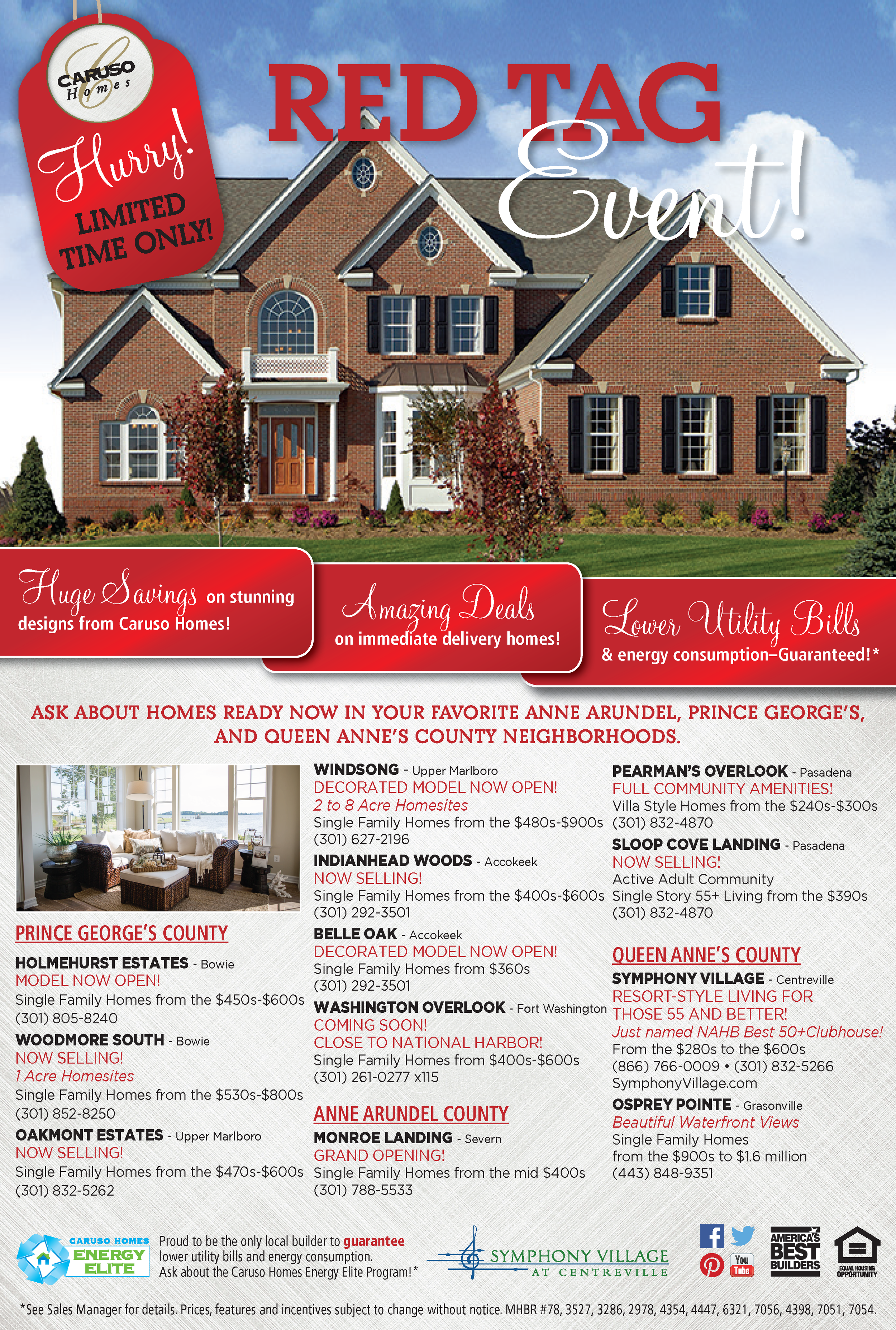 Overall design for Caruso Homes' Red Tag Sale. Winner of the Maryland Building Industry Association's 2015 MAX Award for "Outstanding Multi-Media Campaign."